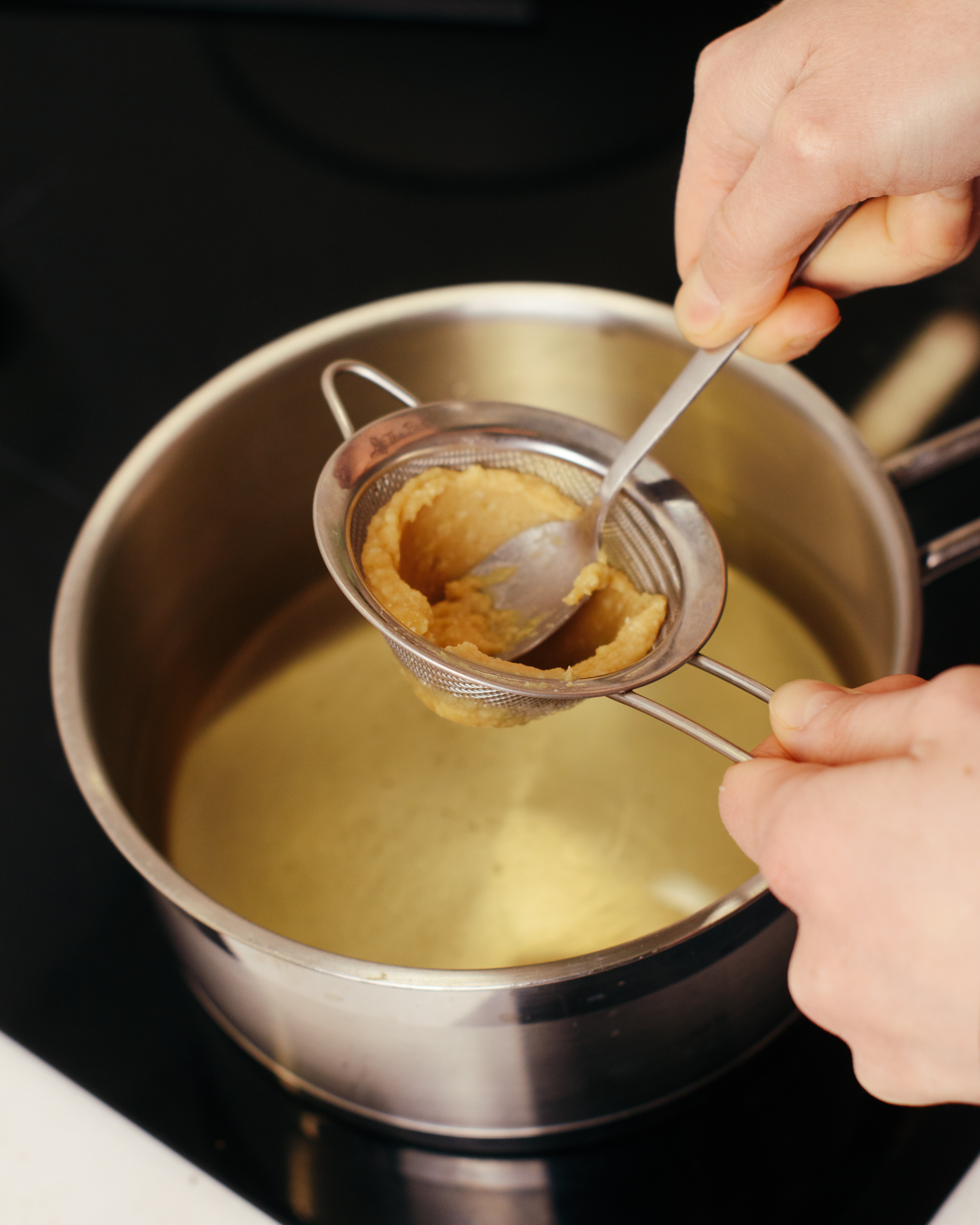 4. W małym sitku umieść 1,5 łyżeczki pasty shiro miso. Zanurz sitko w gorącym bulionie i za pomocą łyżki delikatnie przecieraj miso, aby równomiernie rozprowadziło się w zupie. Dzięki temu unikniesz grudek.