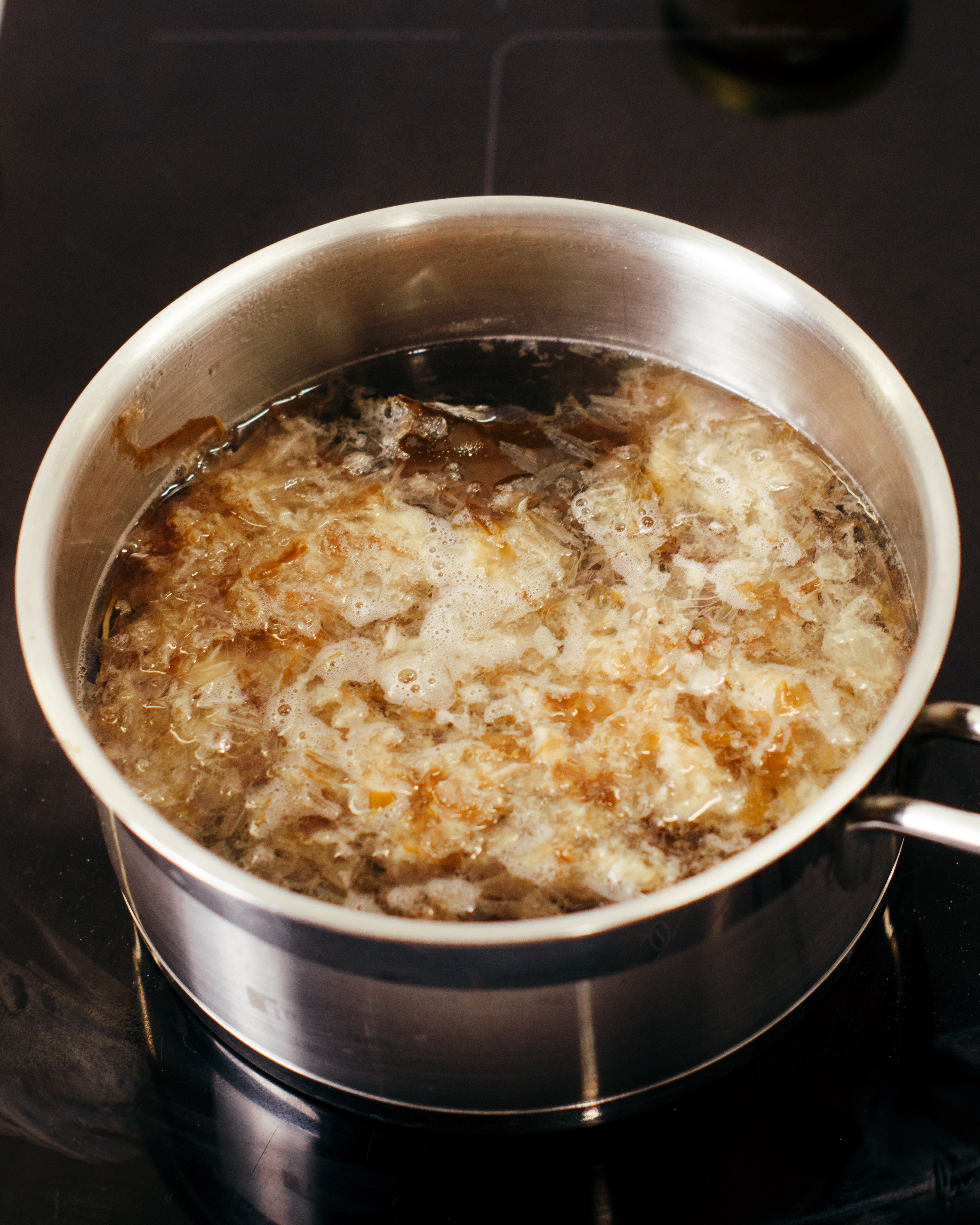 3. Przecedź bulion przez drobne sitko lub gazę, nie wyciskając resztek, aby zachować klarowność wywaru.